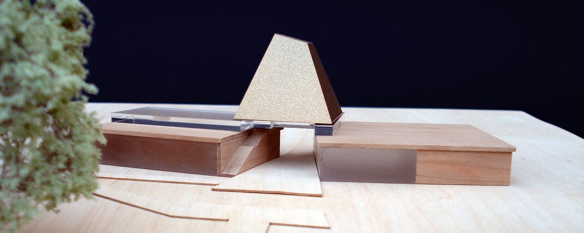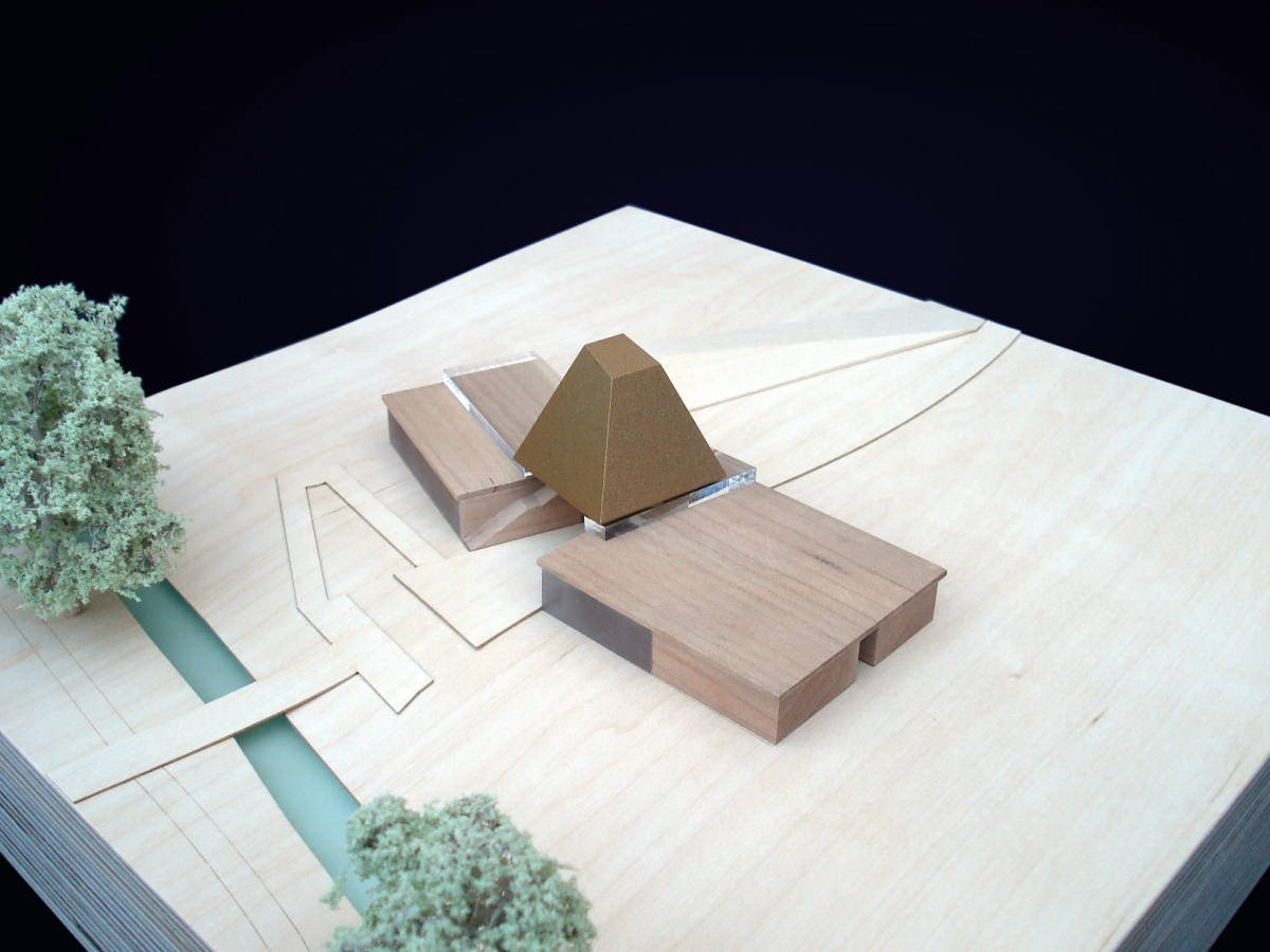 The blocks are made of cherry timber, which was chosen because the grain of timber represents the potential use of a round earth structure. The model shows the beacon which was made out of acrylic and sprayed gold.” James Parkinson
