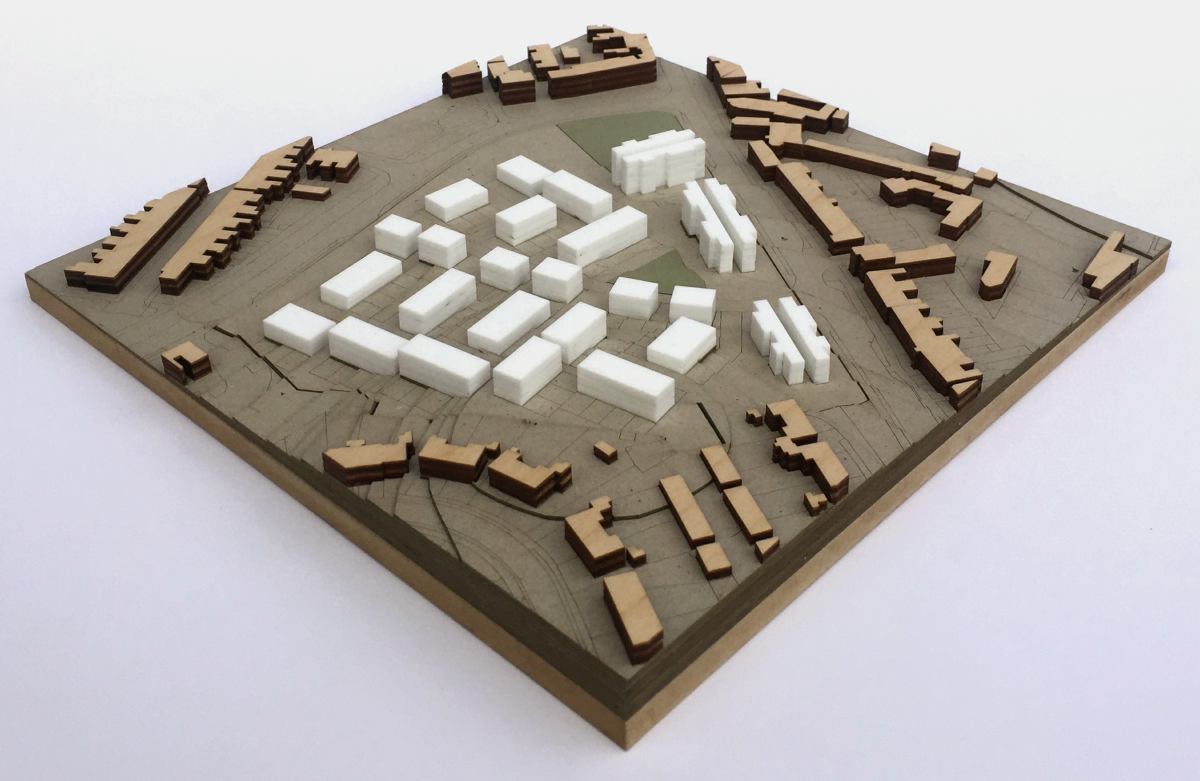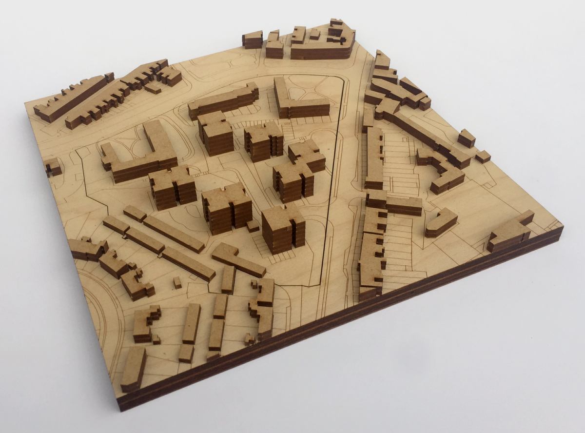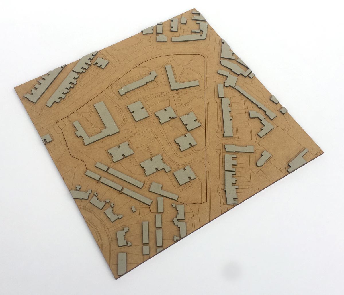 These card models show varying degrees of detail, with different types of card representing different cladding options. Fragments of the artwork used in the submission has been etched onto the card using the laser cutter.