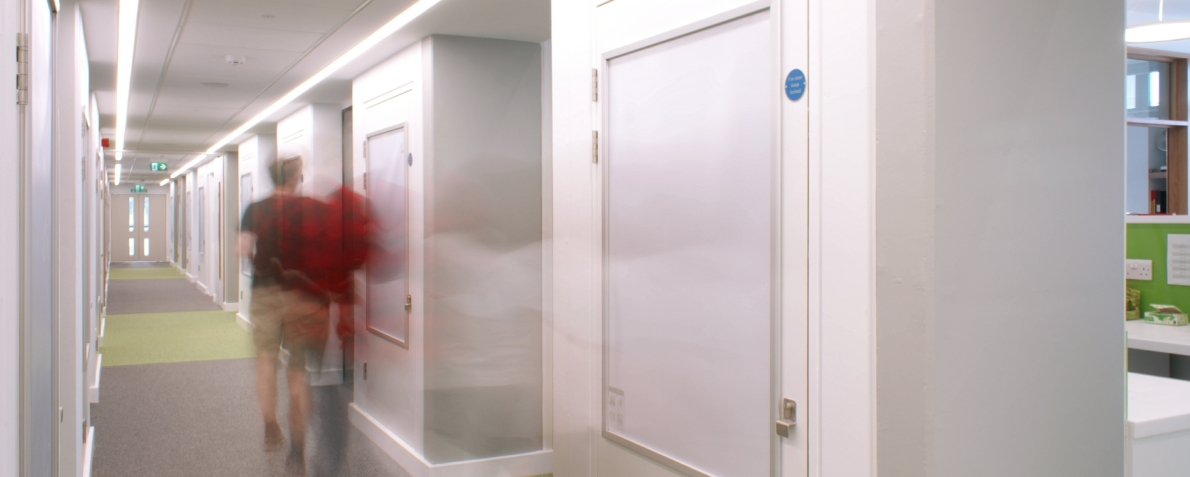 The refurbishment of the 1970’s concrete frame Bateson Building has transformed the former dark and gloomy corridor and highly serviced, large open plan laboratories and individual office spaces into a series of light and airy work spaces with a clear department identity.