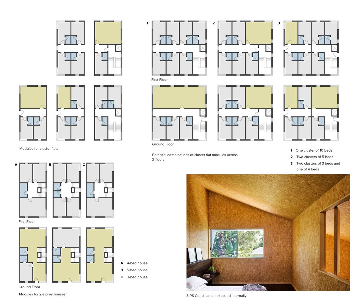 Above: An excerpt from our recent entry to the open contest to design a new accommodation block for students at the Trinity College theological school in Bristol, which featured pre-fabricated modules constructed in SIPs (Structural Insulated Panels) to enable accommodation to be arranged in a variety of combinations, subject to client requirements and changes in demand.