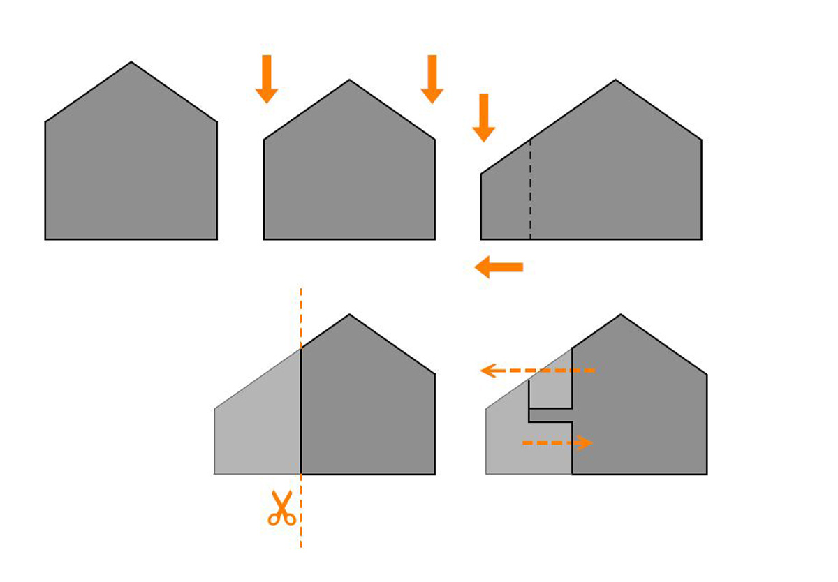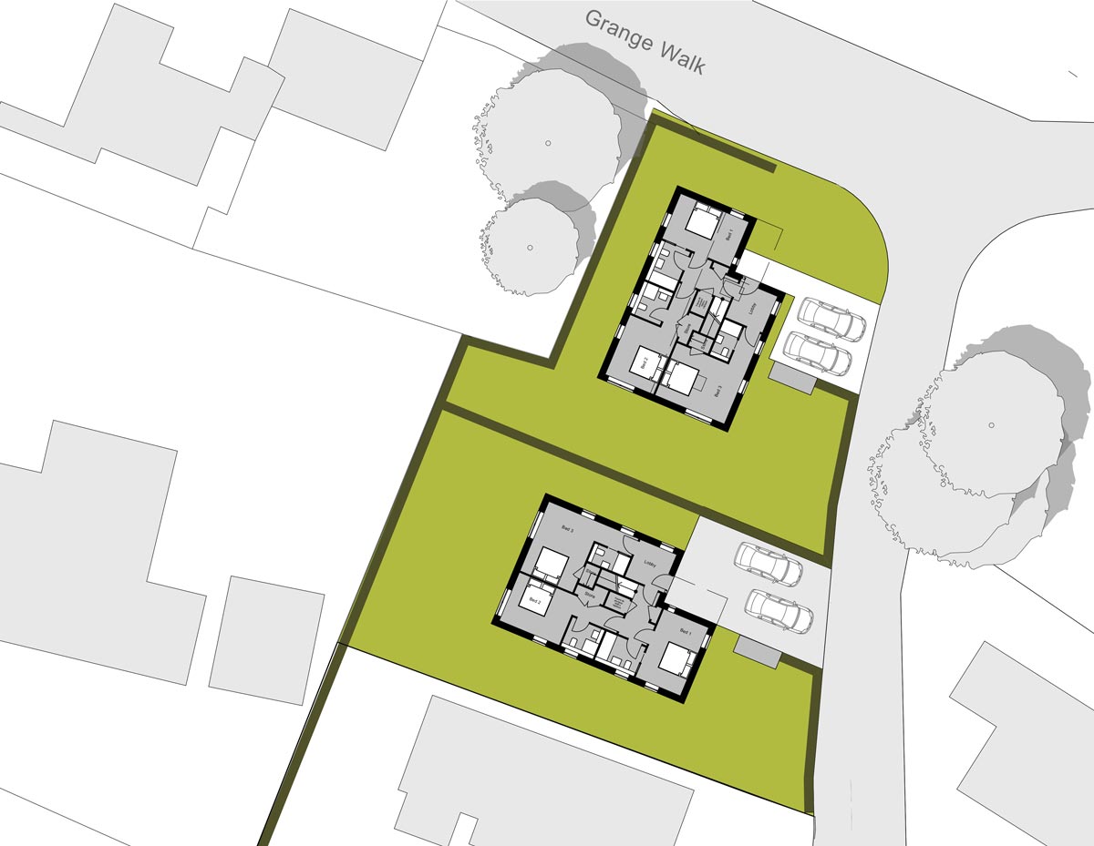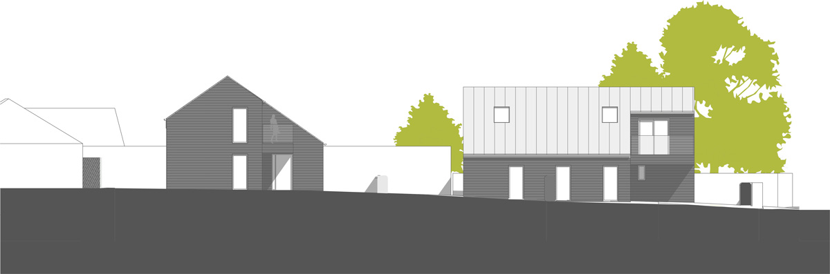 To reduce the visual impact of the new buildings on the streetscape the elevations are broken up into single and two storey elements with lowered eaves at first floor level and a simple setback framing the entrance and the first floor balcony.