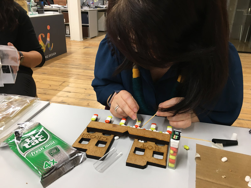 Rosie carefully constructing the pubs archway frontage out of tic tac’s!