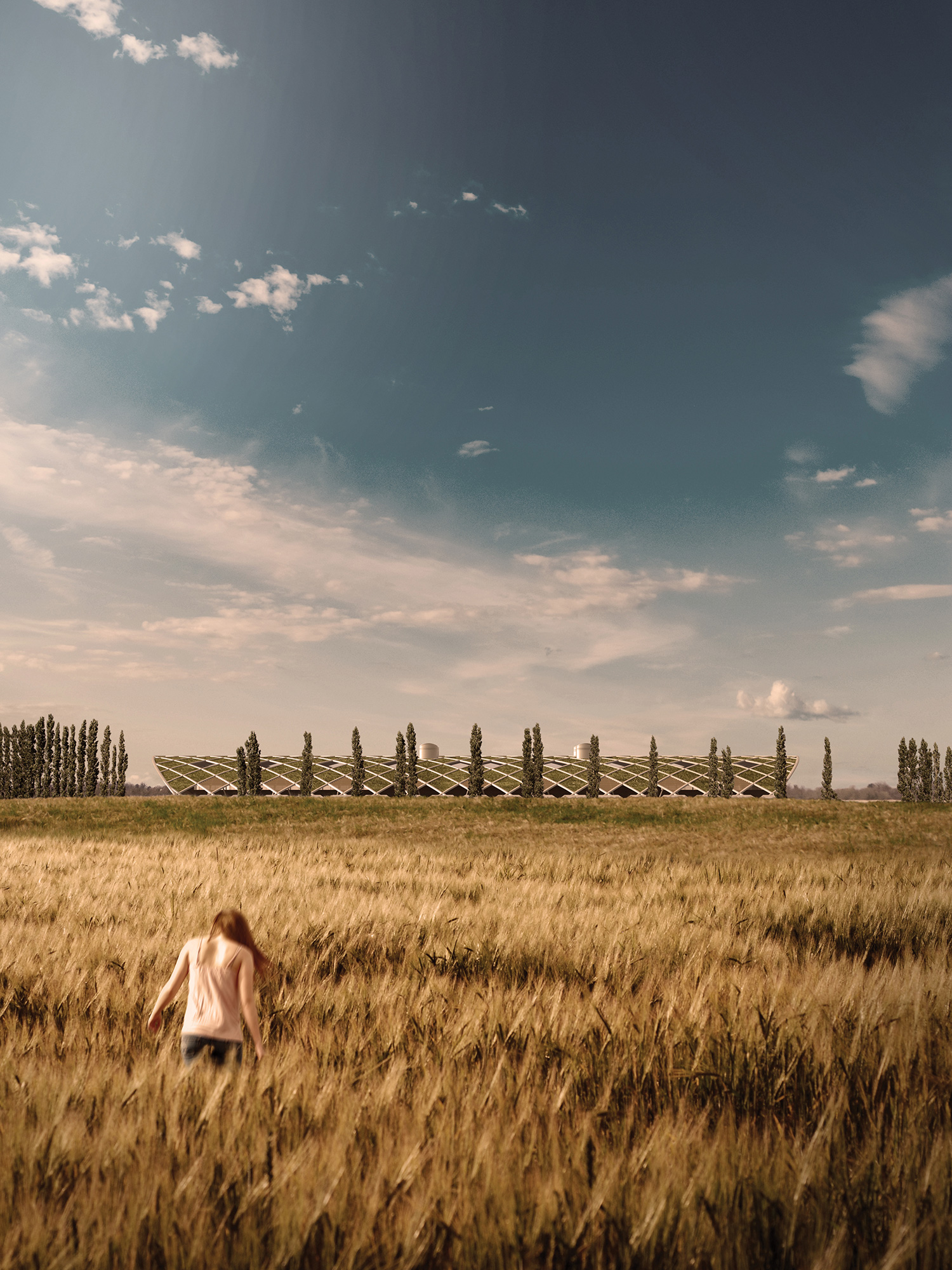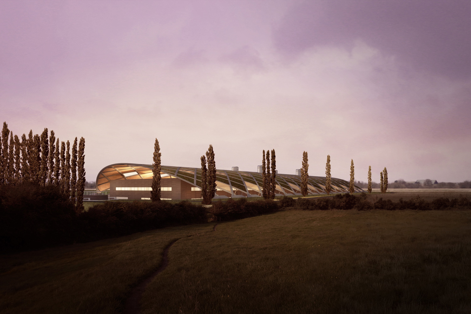 The illustrated scheme is formed into a disused quarry in a rural setting. The plant and machinery is housed in an industrial building with a separate concrete grid shell and green roof structure concealing the industrial building.