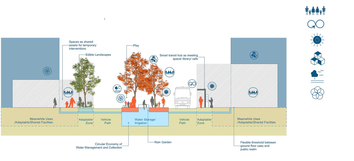 The street is more than a road and footpath but is diversified to create a multifunctional space, connecting communities, accessing shared facilities and becomes a linear park. Biodiversity corridors and village green spaces are designed to support temporary uses, such as local street vendors, community events and festivals. Other amenities, such as playgrounds, outdoor classrooms for all ages and edible gardens are integrated throughout the neighbourhood.