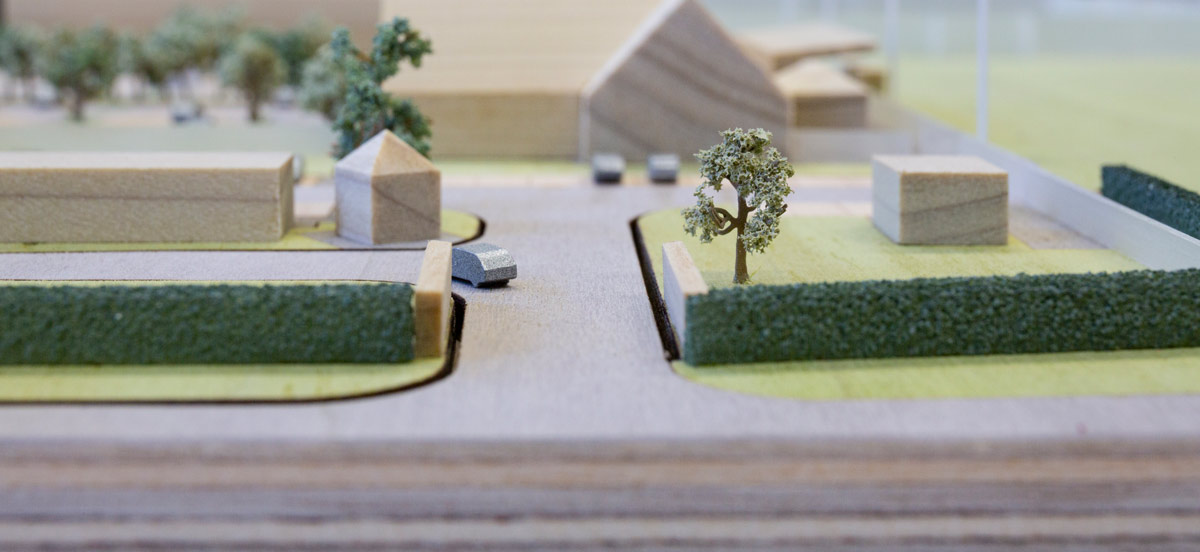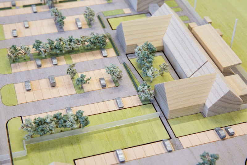 The model features a selection of pre-stained veneers to represent the various surface types within the campus, with the buildings machined from tulip wood.