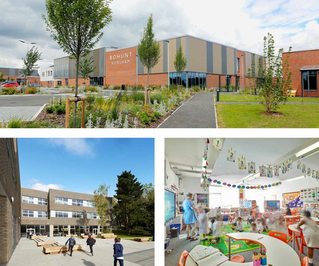 Top: Bohunt School Horsham, Bottom Left: Lycée International de Londres Winston Churchill, Bottom Right: Eltham C of E Primary School