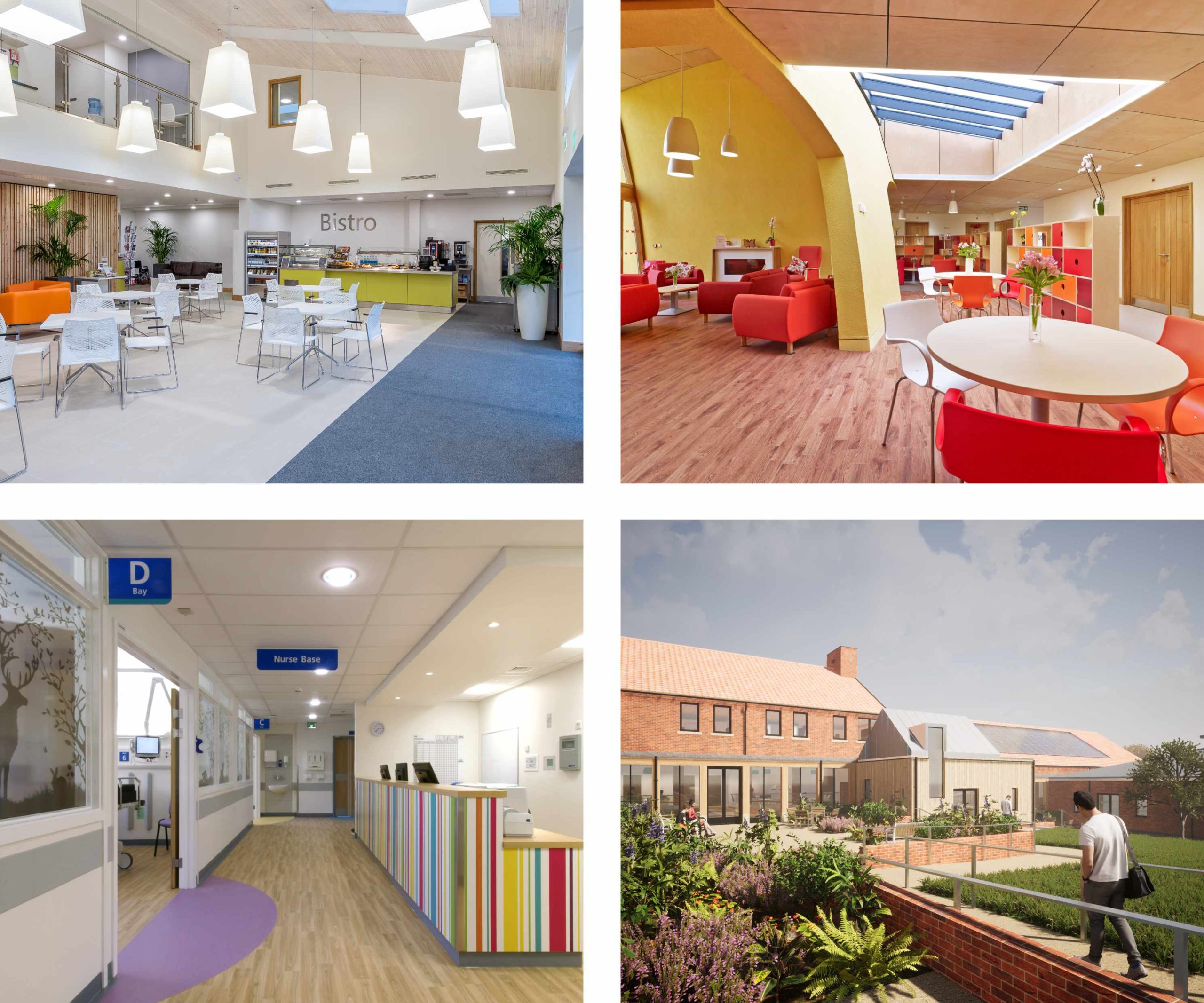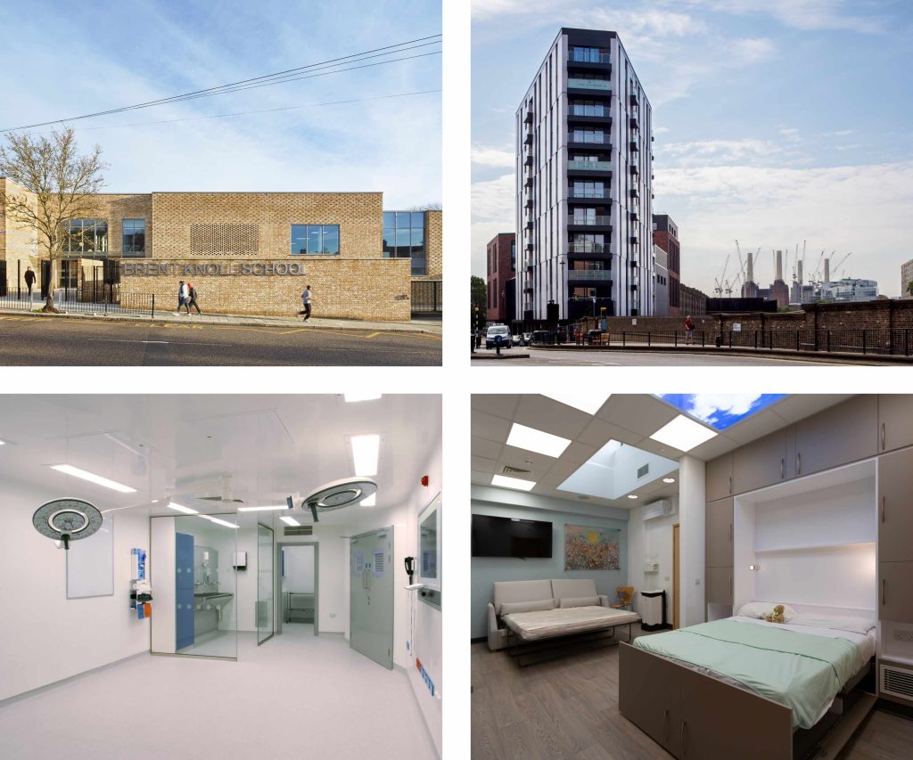 Top Left: Brent Knoll School, Top Right: Ebury Place, Bottom Left: James Paget University Hospital Ophthalmic Theatres, Bottom Right: Queen Elizabeth Hospital Maternity Bereavement Suite