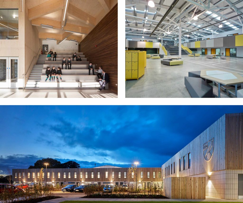 Top Left: Stephen Perse Foundation Senior School, Top Right: UTC Norfolk, Bottom: Norwich City Football Club Lotus Academy