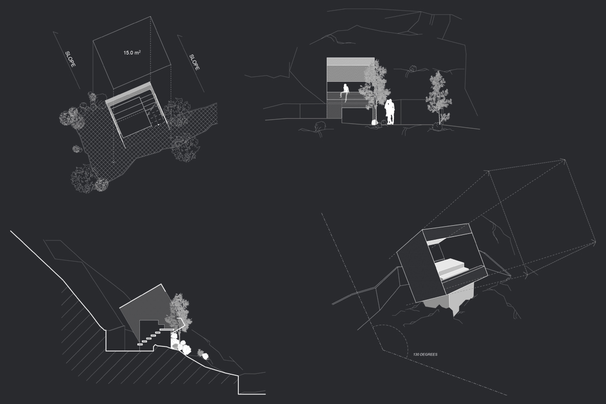The ‘Camping Cabin’ is designed on the basis of forming a small module that can be replicated as a light yet fixed structure. It provides a consistent yet elegant construction using Core 10 perforated metal to extruded perpendicular with the natural contours and cliff face.