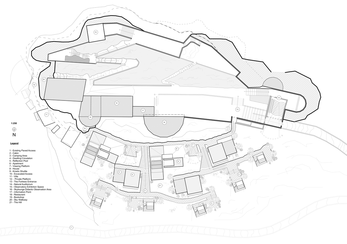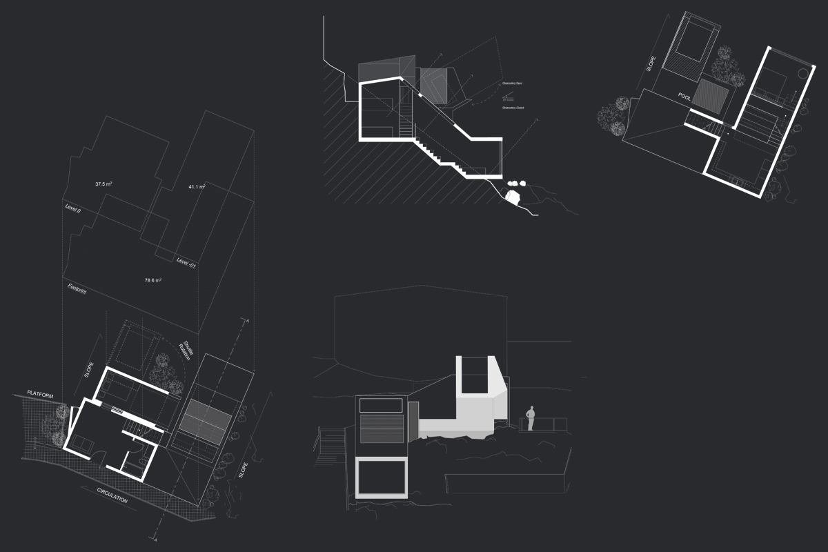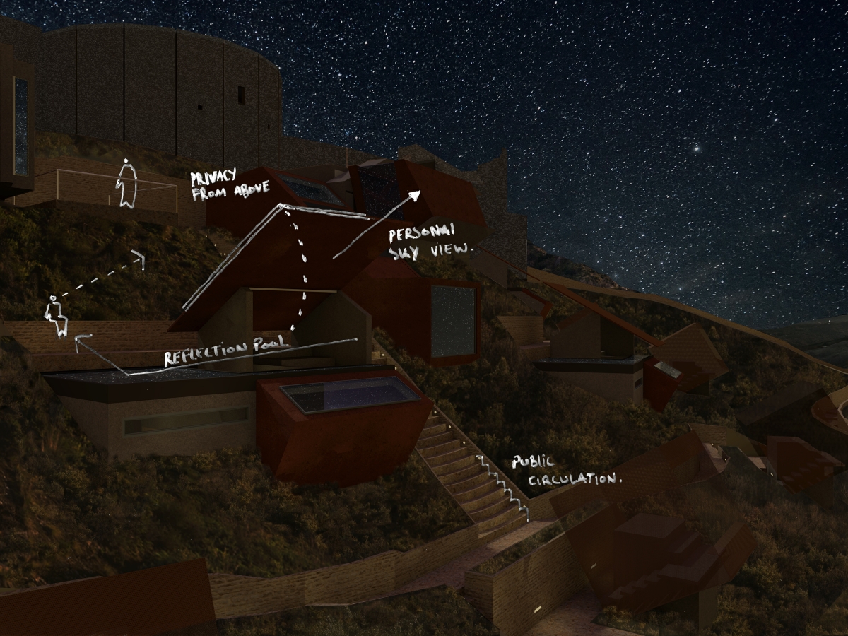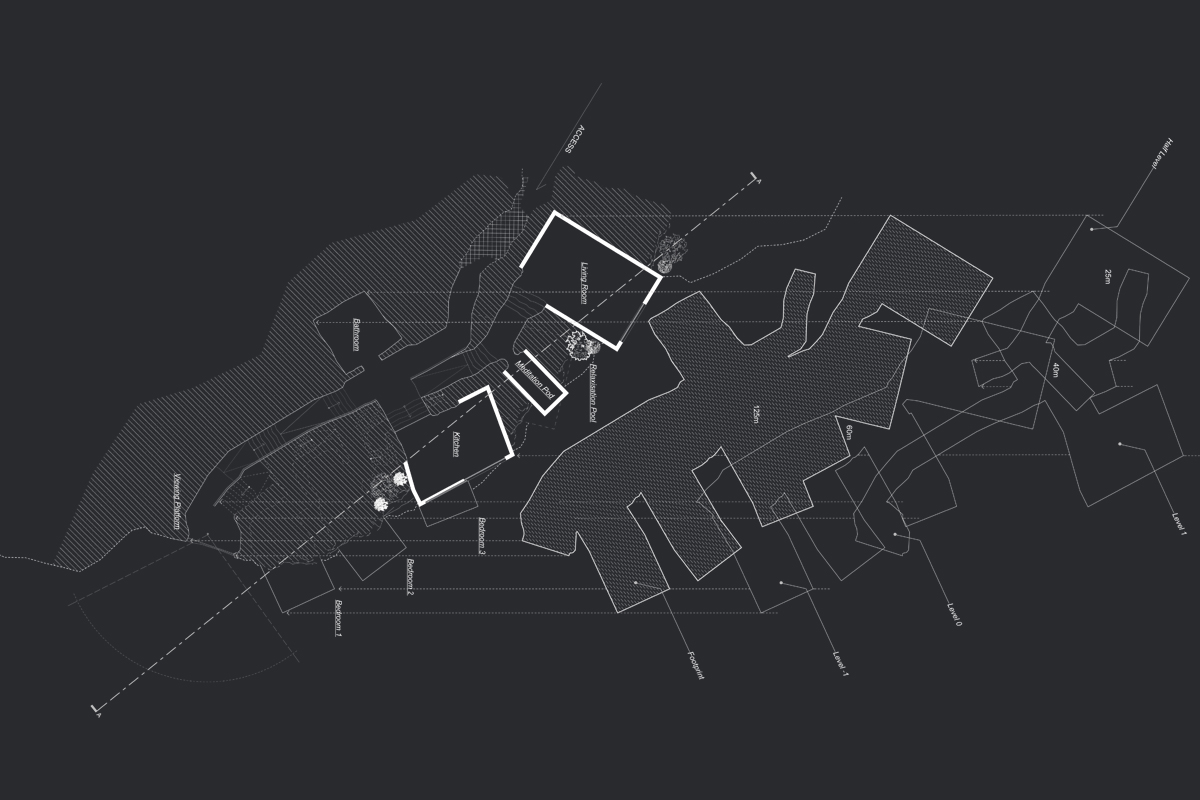 The ‘Kinetic Houses’ provide a luxury and refined experience through its staggered and steeped form. The form of the dwelling is embedded within the terrain and sloped gradient to minimise the profile of the hill.