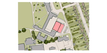 The height and mass of the proposed sports hall has been informed by Sport England guidance. The changing and shower areas are located to the front of the site within a subordinate block that also contains the principal entrance. The building is clad in colour coated composite metal cladding panels with colour matched aluminium flashings and cappings, above fair faced facing blockwork plinth at Ground Level in a 2/3, 1/3 arrangement in an attempt to reduce the apparent monolithic mass of the sports hall.