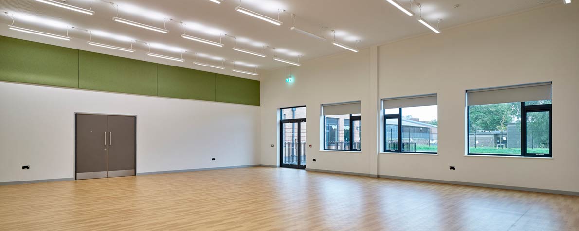 Internally the building is comprised of a number of zones. The main entrance leads to Central spaces, including halls, support spaces for use by all and administration spaces. Primary school and sixth form spaces are located to the west of the main entrance; secondary school spaces are located to the east of the central spaces, with specialist teaching spaces grouped to the south of the secondary school wing. The layout of the school has been designed to facilitate out of hours community use by local clubs or community groups.